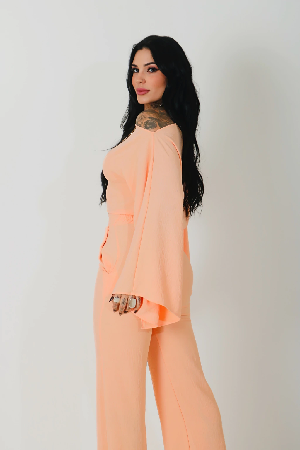 O conjunto acompanha uma blusa e uma calça pantalona confeccionadas em tecido Duna, que garante leveza e qualidade. A calça destaca-se pelos recortes laterais e o elástico na cintura, proporcionando um ajuste confortável e moderno. A blusa traz recortes delicados nas mangas, adicionando um toque especial e contemporâneo ao visual.