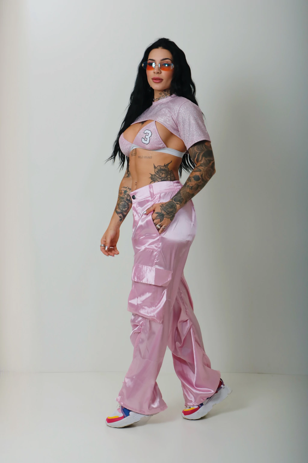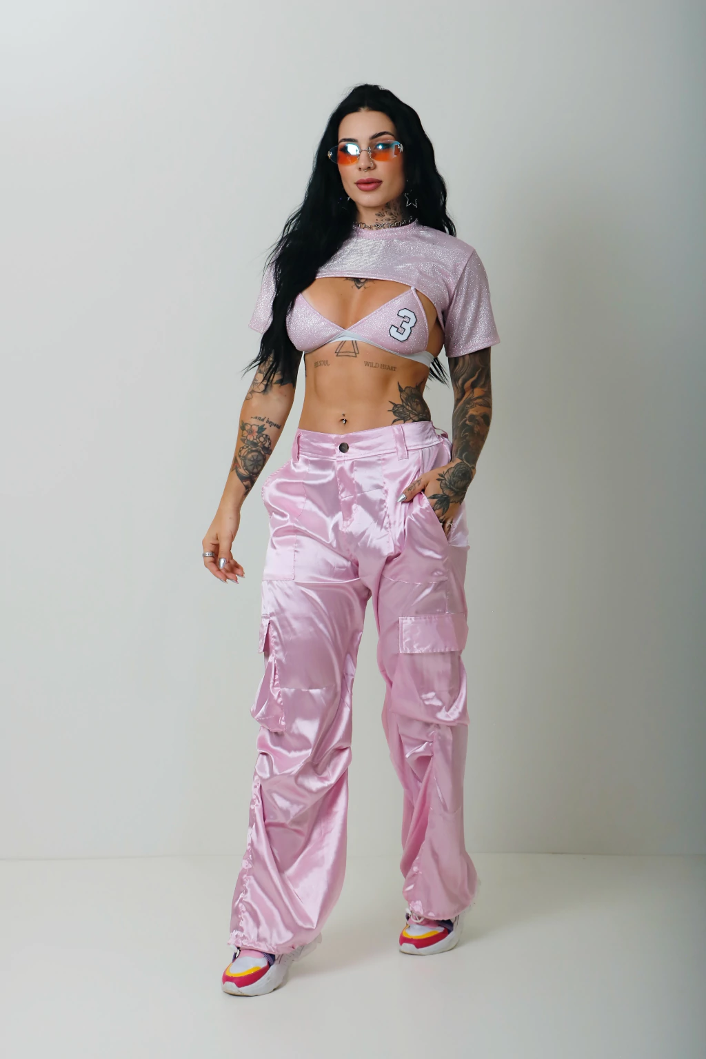 • Calça cargo lurex disponível nos tamanhos P, M e G