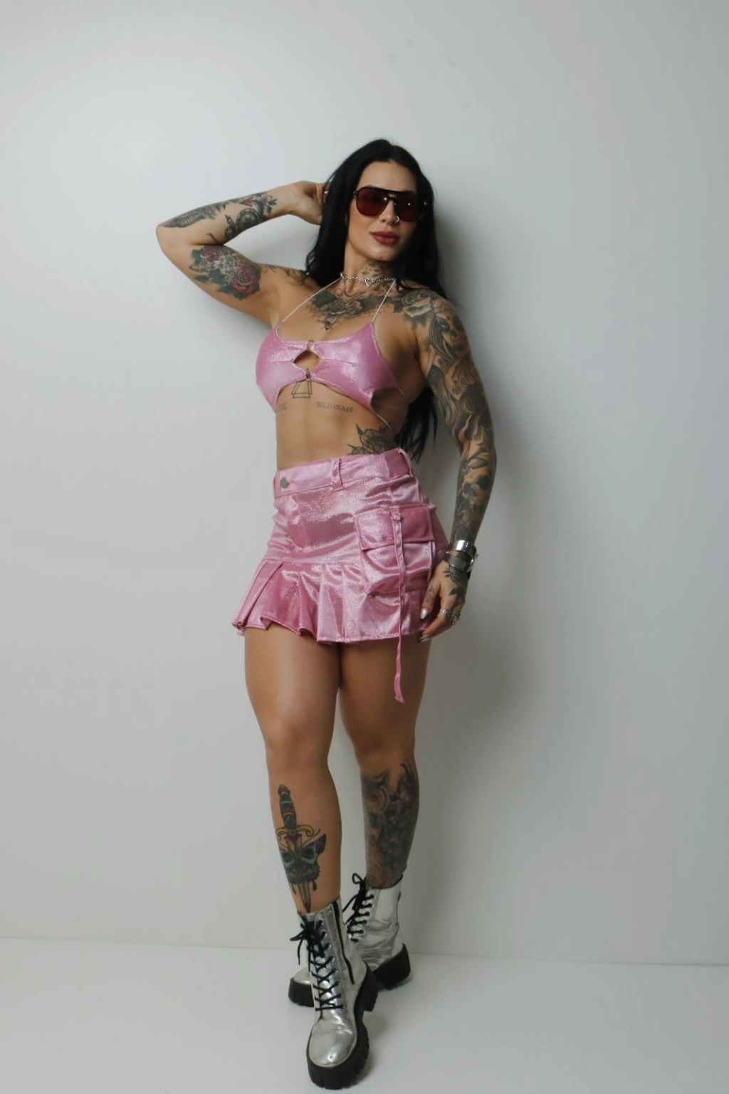 Confeccionada em tecido Gloss (lurex com brilho), essa saia entrega um visual moderno, ousado e super feminino.